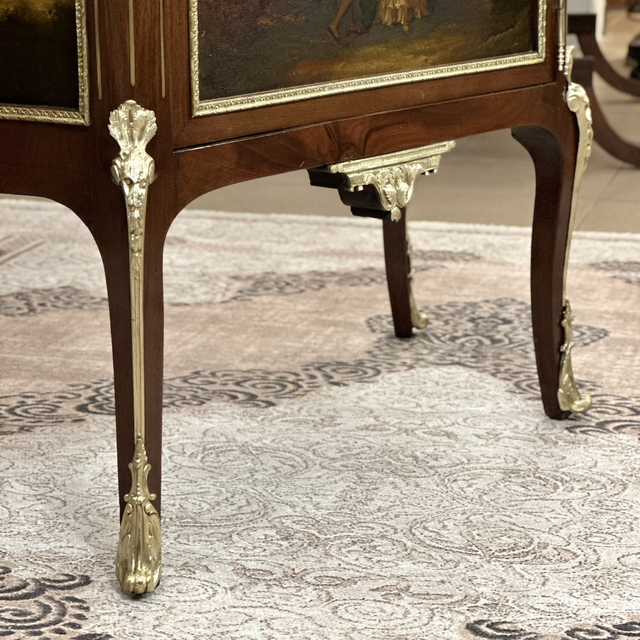 Em mogno, painéis decorativos em vernis Martin, técnica clássica francesa que imita a laca oriental e apresenta cenas galantes pintadas à mão, emolduradas por finas molduras em bronze.